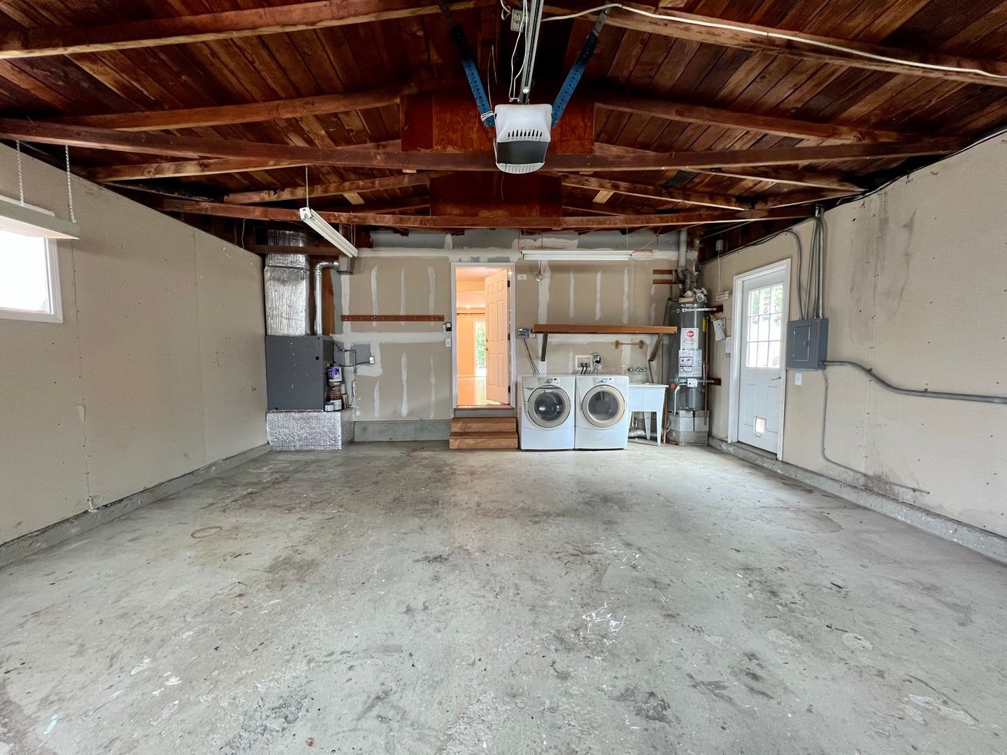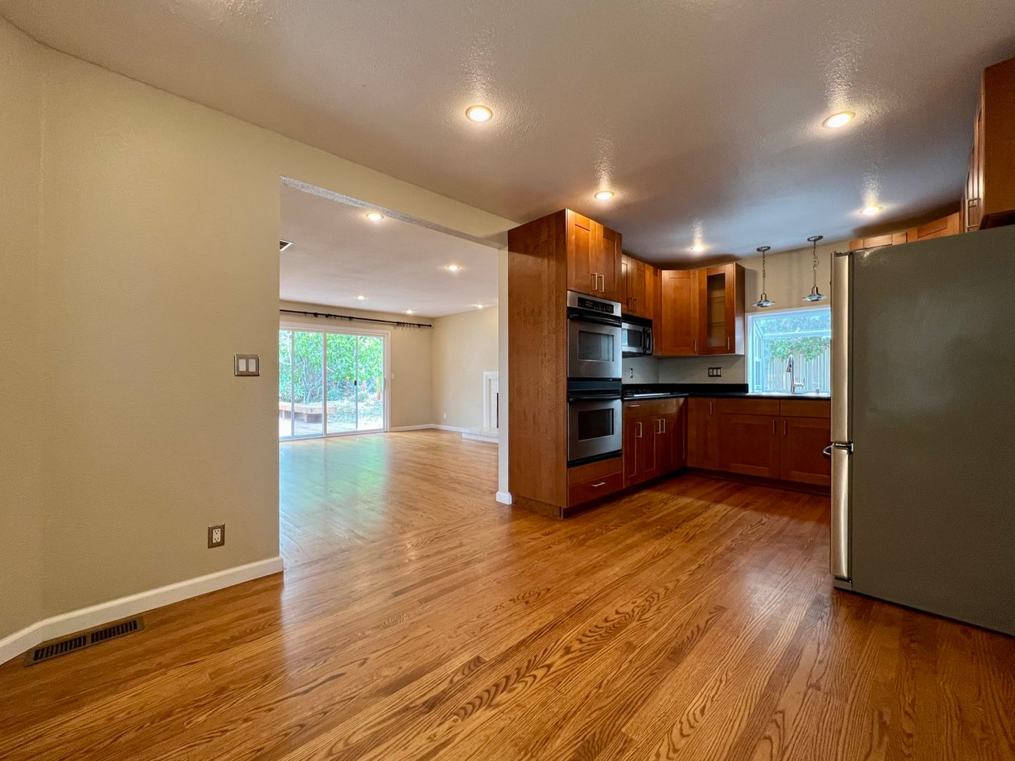 Inside, the home features hardwood flooring throughout, recessed lighting, central forced heating, and a spacious updated kitchen. The kitchen is equipped with stainless steel appliances including a refrigerator, dishwasher, double oven, gas stovetop, and microwave, complemented by dark granite countertops, ample cabinet storage, and stylish light fixtures. The attached two-car garage, accessible through the kitchen and dining area, includes a washer and dryer for added convenience. The master suite boasts an updated en suite bathroom with modern tile flooring and fixtures, while two family rooms (each with direct access to the backyard) provide flexible living and entertaining space.