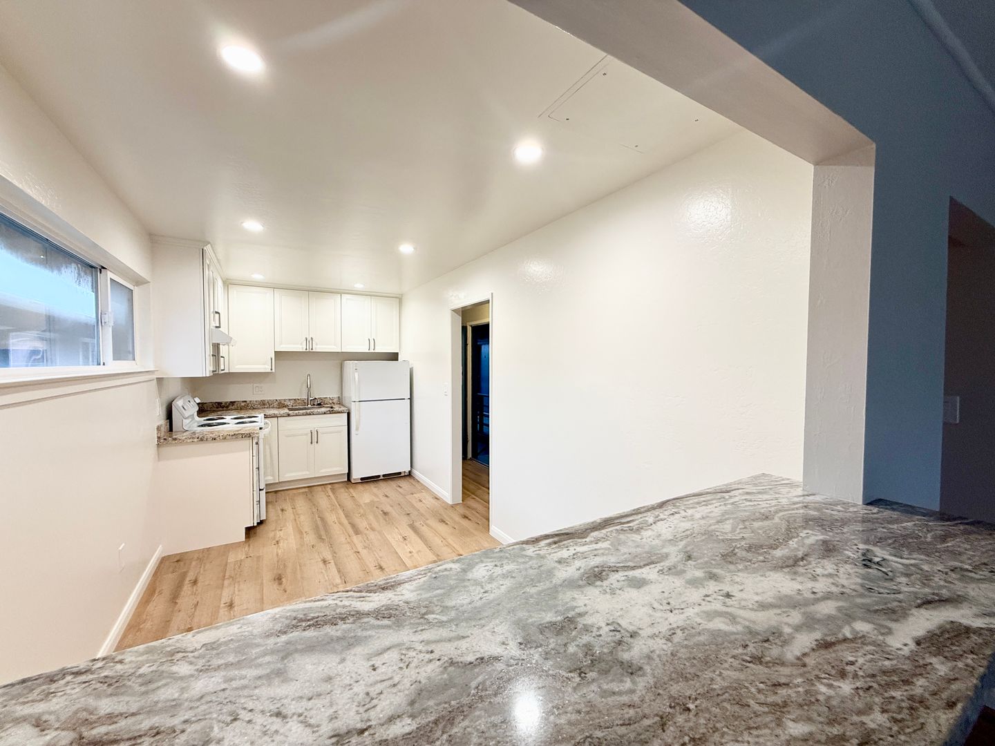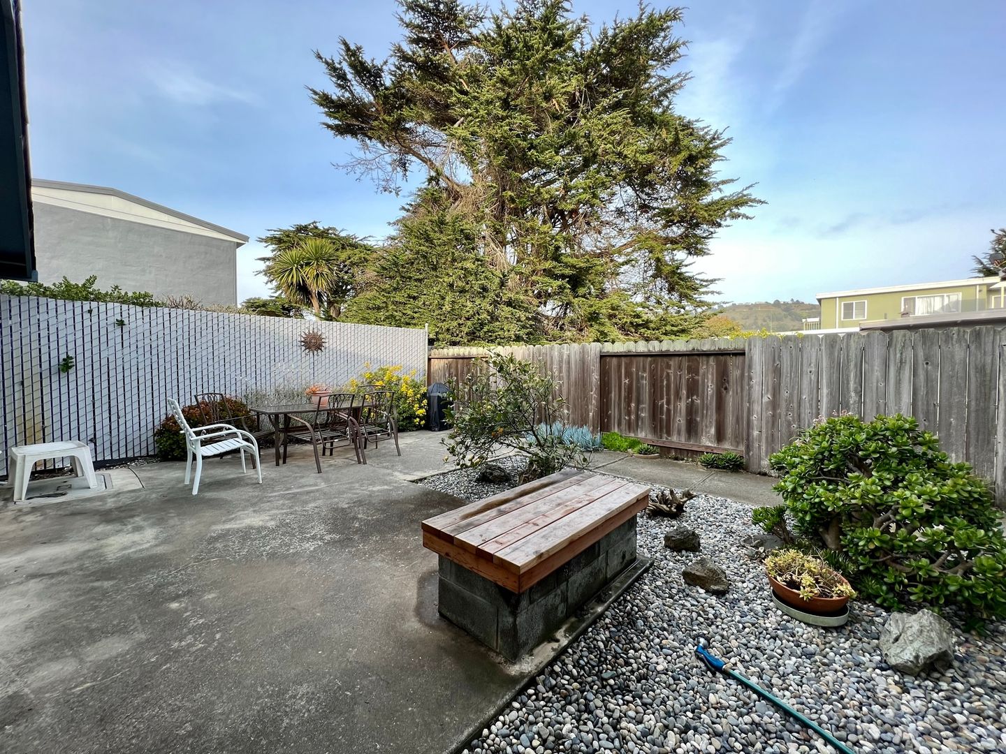 The apartment boasts luxury vinyl plank flooring throughout the main living area and kitchen, while the bedroom has brand newer carpet. The eat-in-kitchen features an electric range and refrigerator with a granite counter top and a passthrough breakfast bar. The living room is quite spacious and provides natural light as well as a view of Sharp Park Golf Course and the distant coastal hills. The bathroom was also completely remodeled. The common areas consist of a patio table and chairs where you may also use a barbeque. There is also a laundry room with a coin-operated washer and dryer onsite. The unit comes with one enclosed single-car garage space and a tandem driveway space. Water and garbage are included in the rent. Tenant pays for PG&E and any additional services such as internet and cable.