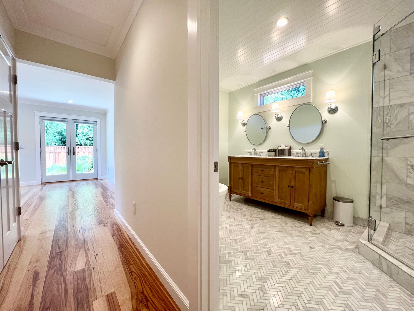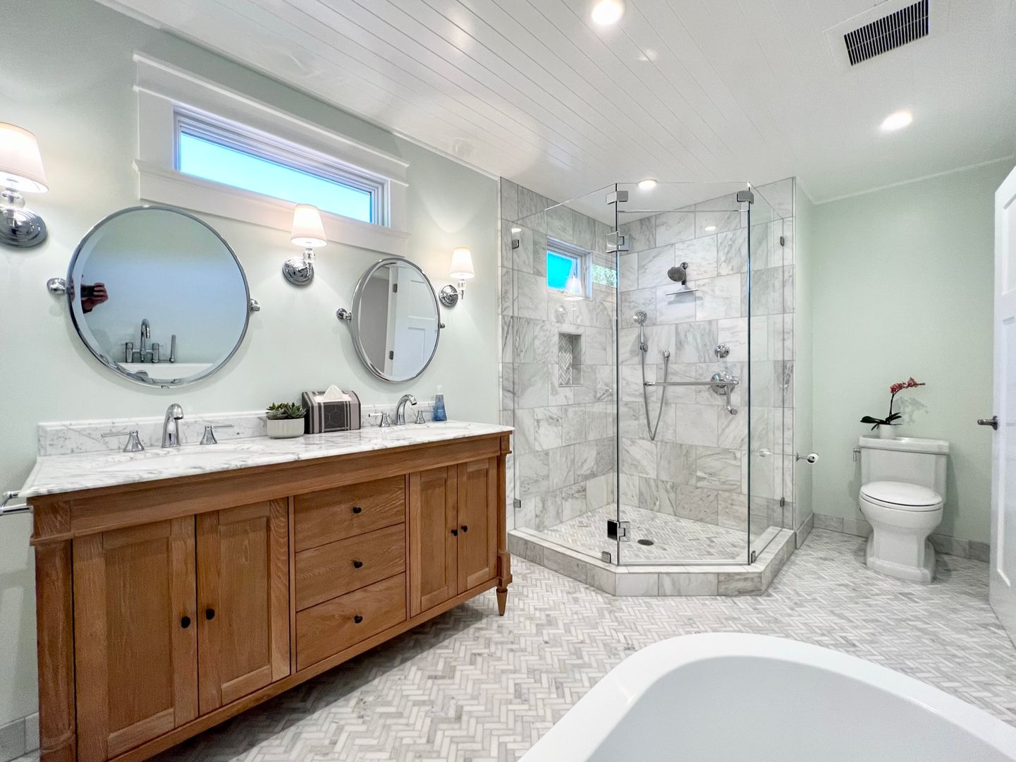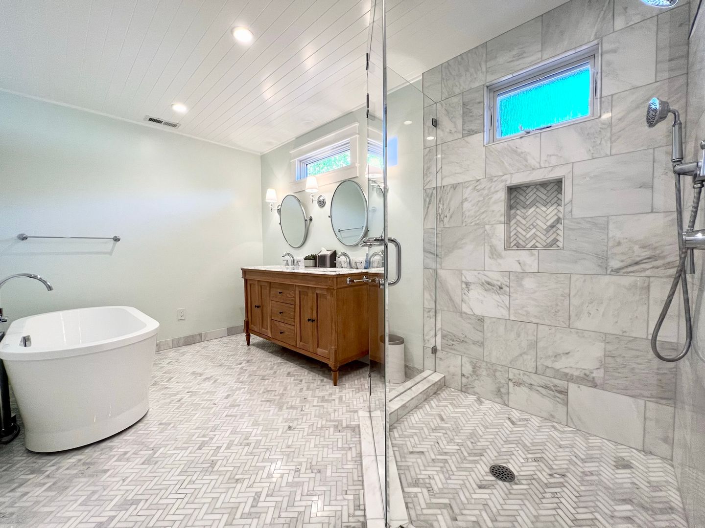 The hallway bathroom has tile floors, mirrored medicine cabinet, glass shelving and a shower surround over tub. Both guest bedrooms are well lit and have ample closet space. The master suite is luxury at its finest with a custom bathroom outfitted with a soaking tub, tiled shower stall with glass enclosure, shiplap ceiling, an elegant dual-sink vanity with plenty of storage and under-cabinet electrical outlets. The bedroom itself is quite spacious and features recessed lighting, ample natural light, patio access, and a sizable walk-in closet that has built-in shelving with plenty of drawers.
