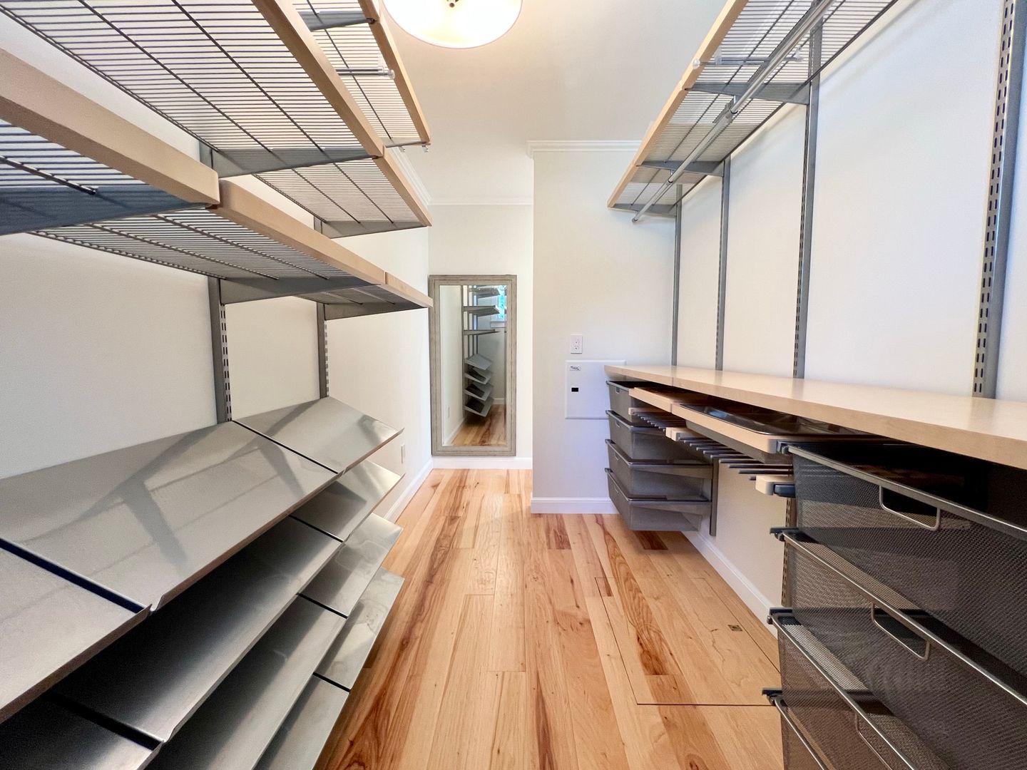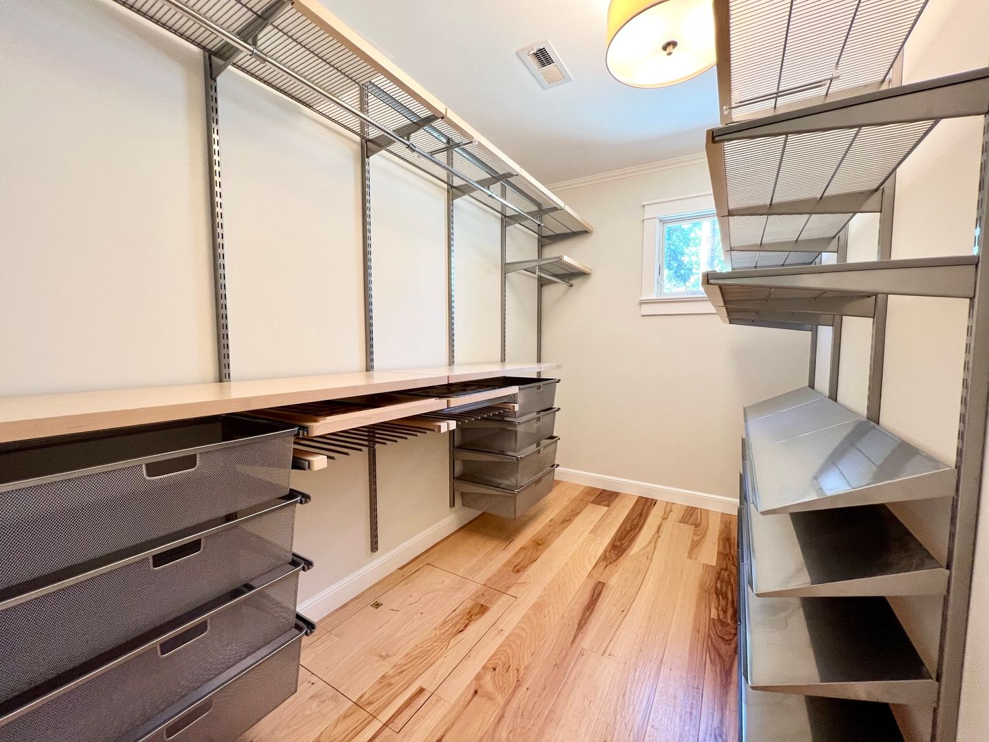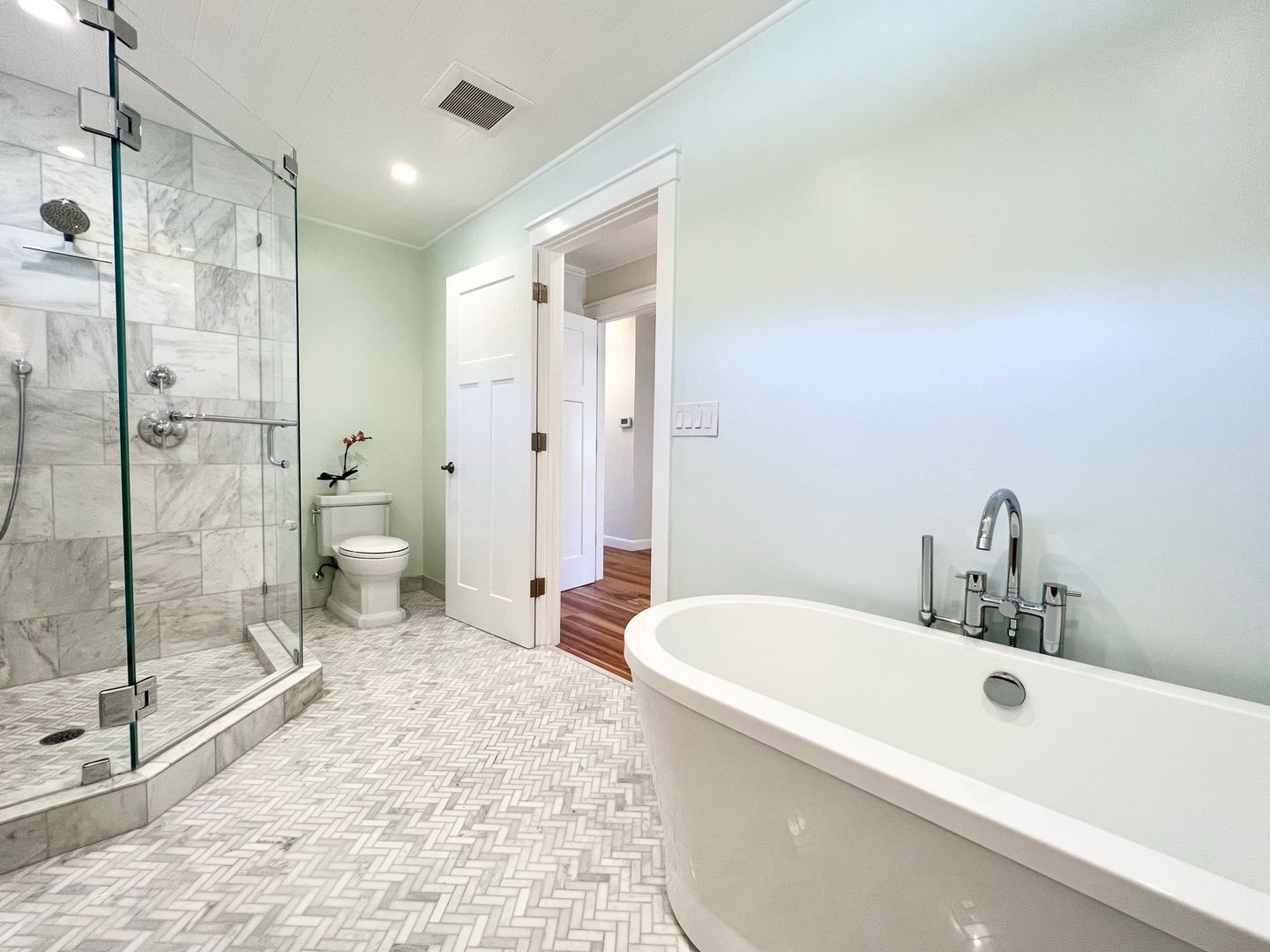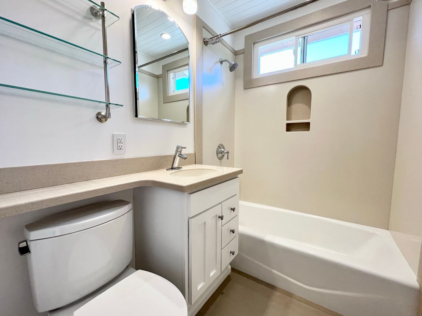 The hallway bathroom has tile floors, mirrored medicine cabinet, glass shelving and a shower surround over tub. Both guest bedrooms are well lit and have ample closet space. The master suite is luxury at its finest with a custom bathroom outfitted with a soaking tub, tiled shower stall with glass enclosure, shiplap ceiling, an elegant dual-sink vanity with plenty of storage and under-cabinet electrical outlets. The bedroom itself is quite spacious and features recessed lighting, ample natural light, patio access, and a sizable walk-in closet that has built-in shelving with plenty of drawers.