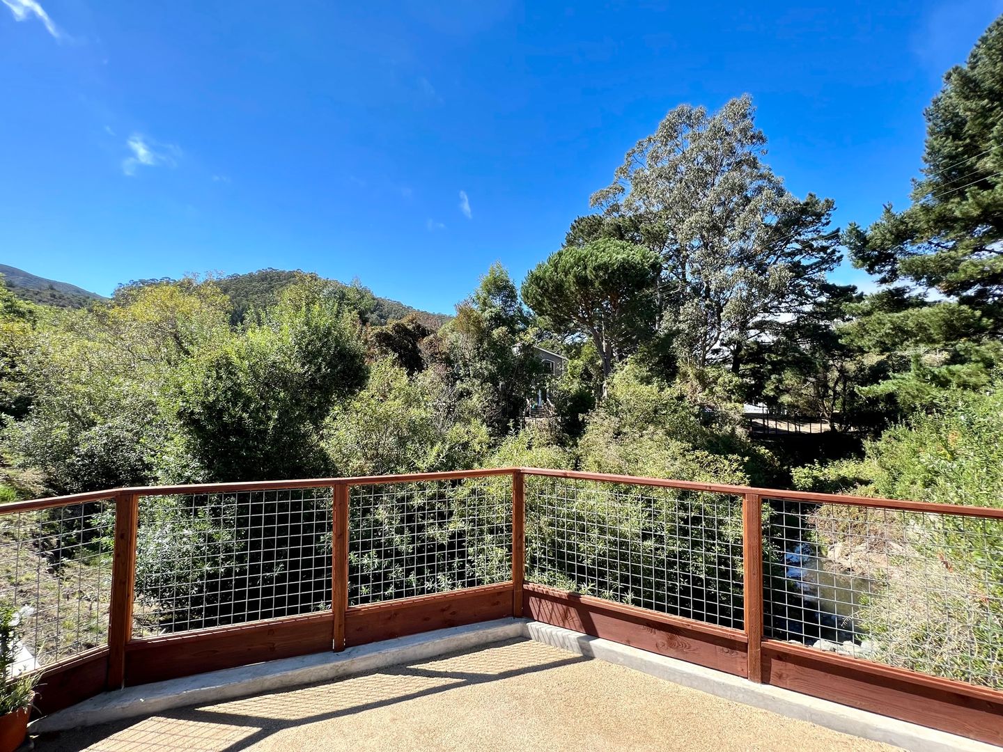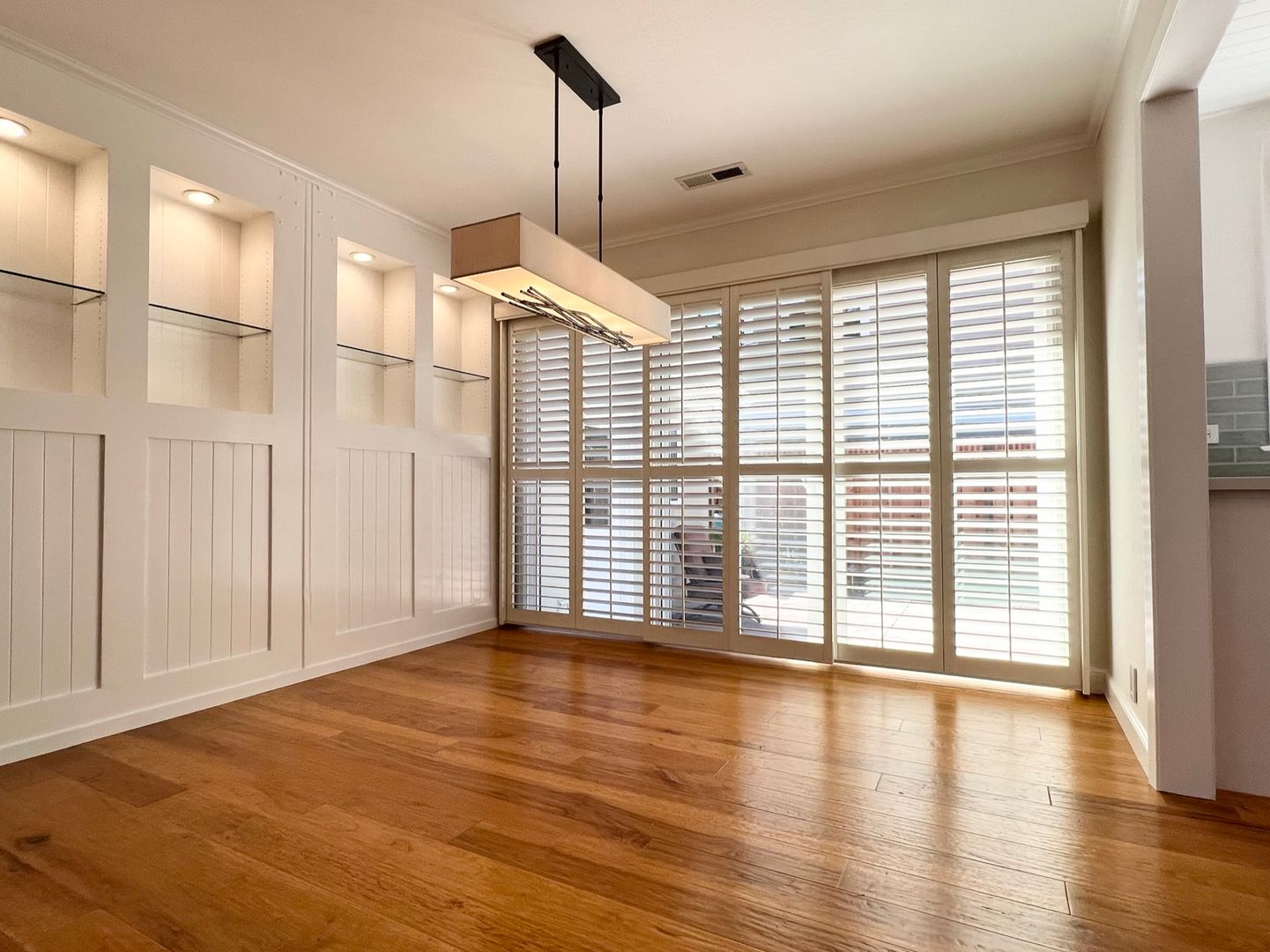 The home features premium finishes throughout, which include stunning wood floors, plantation shutters, crown molding, double-pane windows, a lovely gas fireplace and ample lighting with a mixture of recessed lighting and stylish fixtures. The dining room has built-in lighted shelf space and sliding-door access to the back yard/patio area. Enjoy a gourmet kitchen appointed with quartz counters, under-cabinet lighting, shiplap ceiling, subway tile backsplash and stainless-steel appliances. The backyard/patio area is perfect for entertaining or relaxing. It boasts mature landscaping with an irrigation system, ambient night lighting, a below-grade fire pit area and serene views of the creek below and the distant coastal mountains.